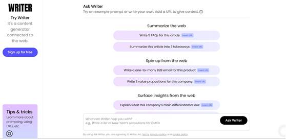 With Writer’s AI platform, you can generate text faster, and it is free to try.