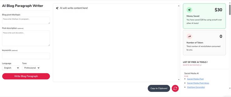 Scrip Ai also includes other tools such as hashtag generators, caption generators for Twitter and Instagram, LinkedIn post generators, scriptwriters, article and email paraphrasers, rewriters, translators, and many more.