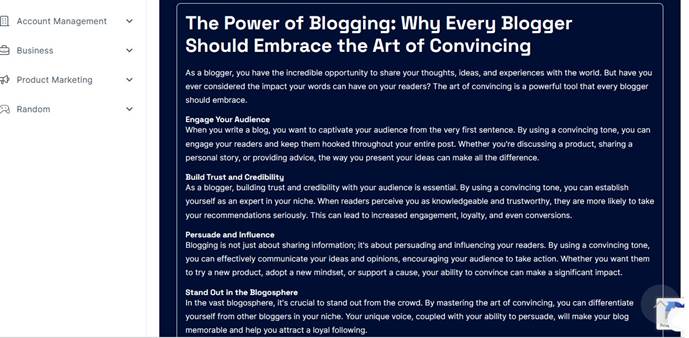 Once you’ve completed the details, you need to solve a re-captcha and click the “write” button. It will quickly generate the content as you specified.