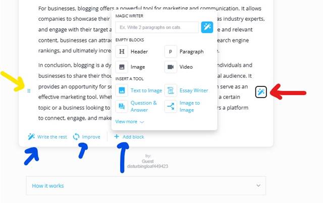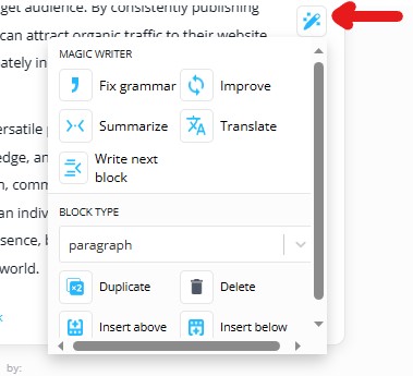 There is also an option to further edit the generated content with more cool features such as improve, fix grammar, summarize, write the next block, and much more.